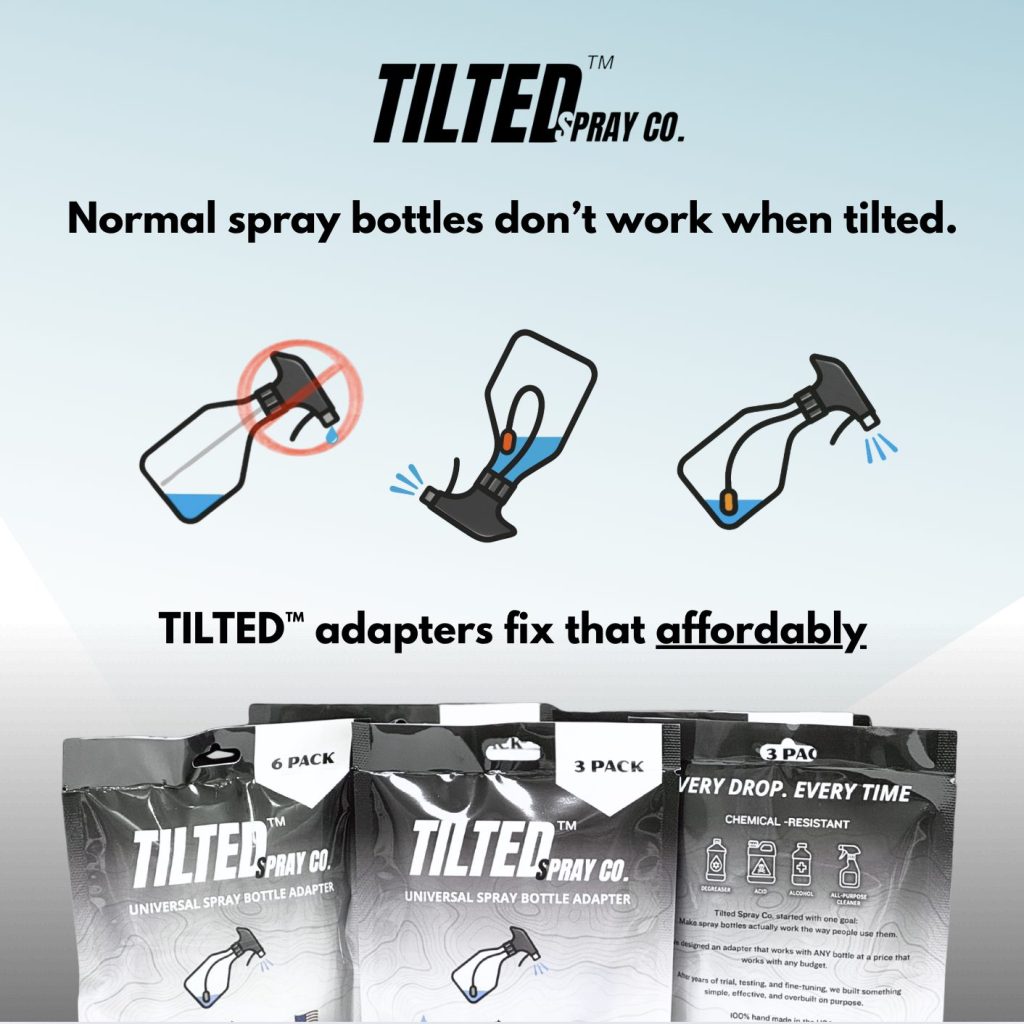 Take your spray bottles to the next level with the Tilted 360 Spray Bottle Adapter – a simple, durable upgrade that lets you spray at any angle without losing suction or wasting solution. Designed for professionals and prosumers alike, this innovative adapter turns ordinary spray bottles into true 360° sprayers that work right side up, sideways, or upside down.