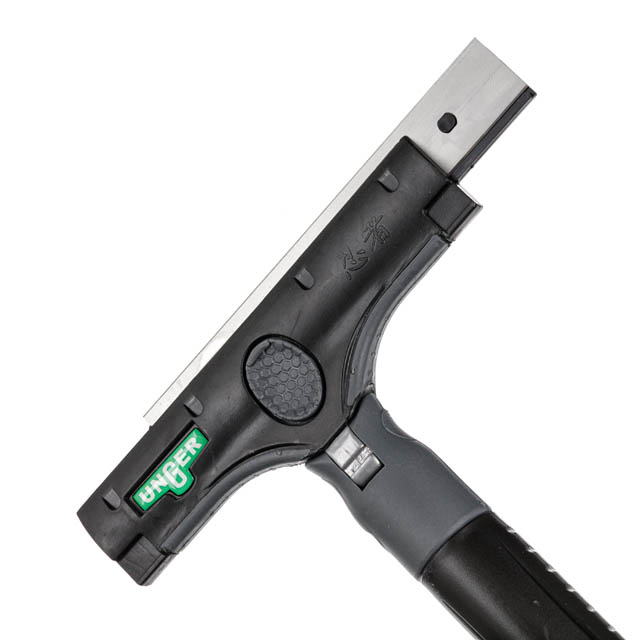 The Unger ErgoTec Ninja Scraper System gives window cleaners an all-in-one solution for safe, efficient scraping – combining a versatile scraper, a secure holster, and a belt-ready combo. The Ninja Scraper’s ergonomic handle stays light and comfortable in your hand while offering a non-slip grip for better control during long jobs. With a clever push-button, you can quickly change the scraper head’s angle from 0° (straight) to 30° (angled) – ideal for adapting to different surfaces or switching between close-up work and pole scraping. When paired with a compatible extension pole, the scraper locks securely onto the universal locking cone for high-access cleaning. Premium stainless steel blades and a protective safety cap make the system dependable for daily use.